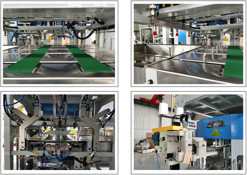 Bag Supplying Machine→Take Empty Bag→Open Empty Bag→Bag Clamping and Feeding Mechanism→Bag Bottom Flapping Mechanism→Bag Horizontal Moving & Pocket Mouth Clamping Mechanism→Standing Bag Conveyor→Auto bag folding and sewing→Finished bag