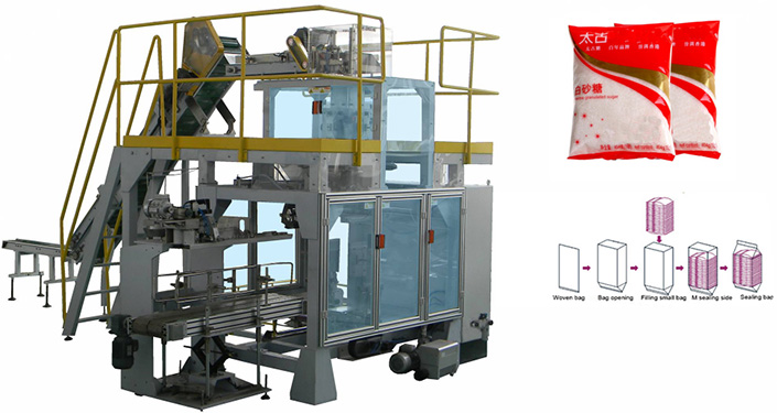 Refers to the equipment that completes the primary packaging of the product and then performs the outer packaging. It is a fully automatic process that automatically loads the products output by the upstream vertical packaging machine into a woven bag and sewing the package according to requirements (arrangement form, quantity, etc.) Packaging process.